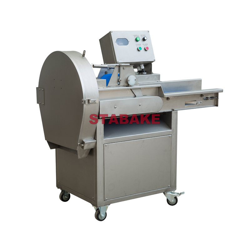 La máquina tiene tres cuchillas o un disco para cortar en cubitos de una sola vez, que se puede girar y cortar en el aire. La cuchilla no corta directamente sobre la cinta transportadora, lo que es fácil de limpiar y no daña la cinta transportadora.