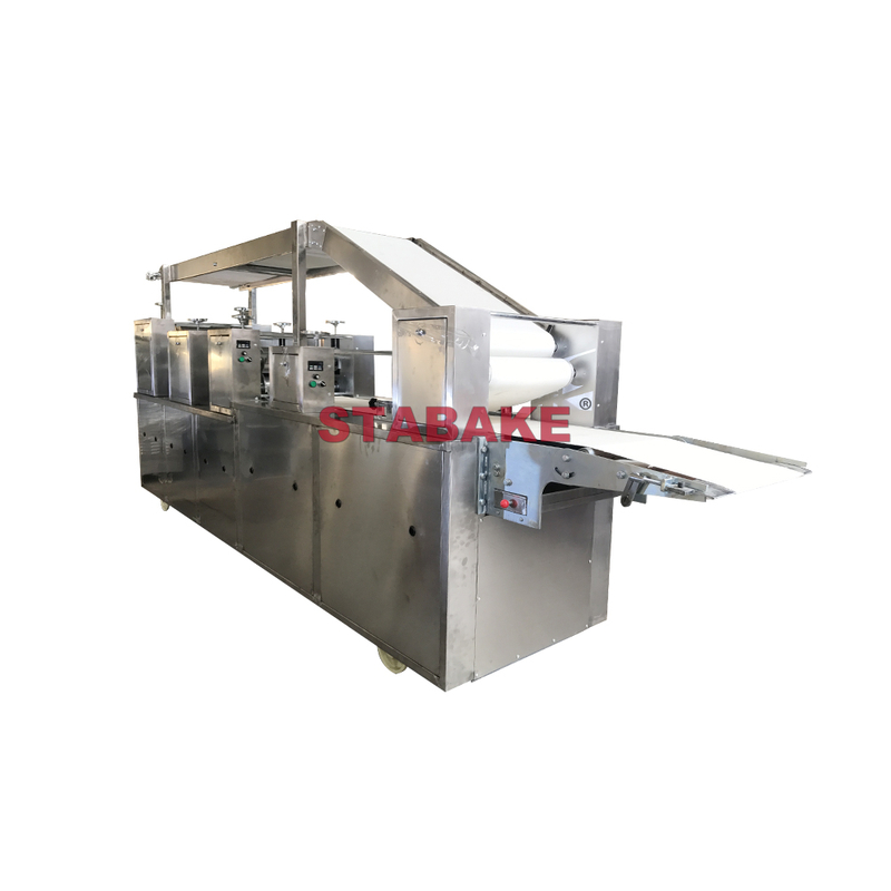 Actuación: Coloque la masa mixta en la máquina, presione a través de tres rodillos y luego córtala en parisiones de galletas a través de un rodillo del molde. El exceso de residuos se recicla automáticamente, y las galletas se transportan sincrónicamente a la bandeja para hornear a través del transporte de doble cadena. Se puede usar con horno de túnel de cadena o horno rotativo para hornear.